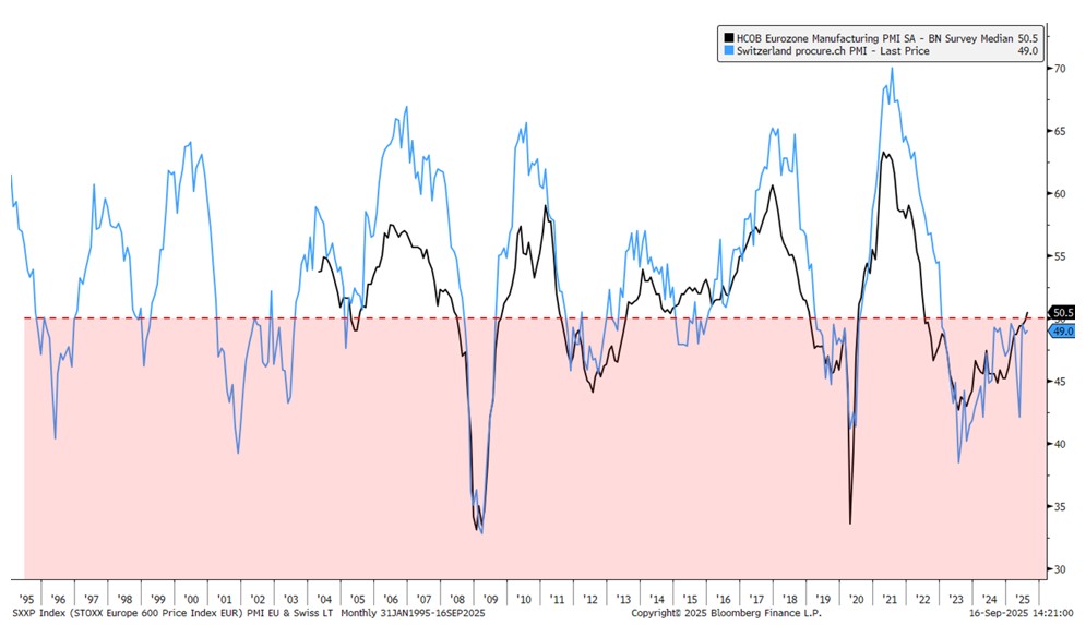 Si le contexte transatlantique est source d’inquiétude, l’Europe, qui reste malgré tout la première destination des exportations helvétiques1, envoie quelques signaux positifs de nature à constituer un soutien inattendu pour l’économie suisse. Après une année 2024 marquée par une récession technique en Allemagne, les indicateurs avancés montrent une stabilisation progressive de l’économie européenne. Le PMI manufacturier allemand, tombé à des niveaux historiquement bas, a amorcé un redressement durant l’été 2025 et le récent rebond du climat des affaires en Allemagne (IFO) confirme un certain optimisme qui avait disparu Outre-Rhin. De même, le mois d’août a vu l’indice PMI de la zone euro repasser au-dessus du seuil de croissance de 50 pour la première fois depuis plus de 3 ans, l’accord conclu cet été entre l’UE et les États-Unis ayant permis de lever une partie de l’incertitude. Ce mouvement reste modeste, contredit par la valeur de septembre (à nouveau négative), mais laisse espérer une reprise graduelle en 2026, portée notamment par les importants programmes allemands d’investissement et des conditions monétaires plus accommodantes. La reprise, encore timide, des permis de construire dans la plupart des pays européens en est un signe encourageant. Une telle amélioration serait particulièrement bénéfique pour la Suisse et pourrait compenser partiellement l’effet négatif des taxes américaines, offrant un relais de croissance aux exportateurs suisses. L’indice PMI suisse est quant à lui toujours en territoire de contraction, pour le 32ème mois consécutif, mais étant donné sa forte corrélation avec celui de la zone euro, les choses pourraient graduellement s’arranger pour le secteur manufacturier.